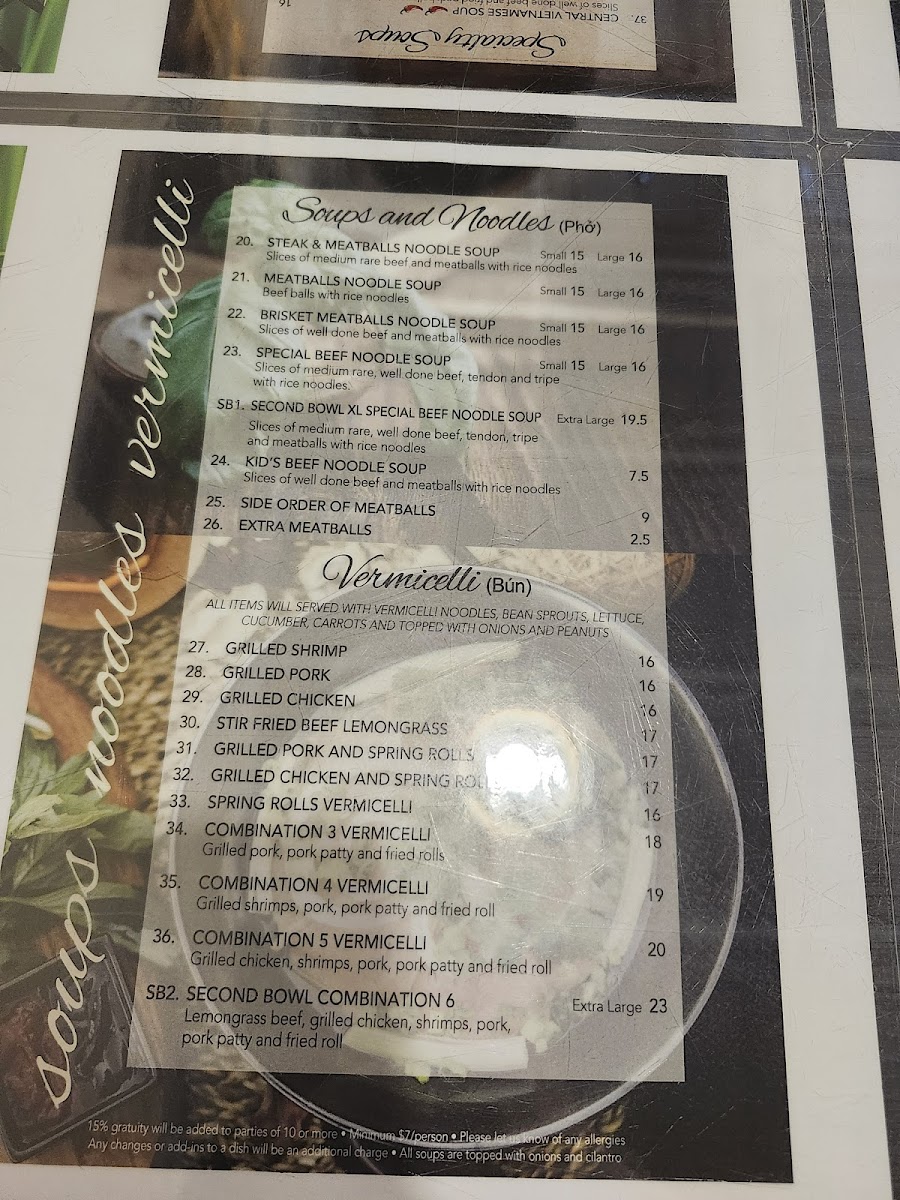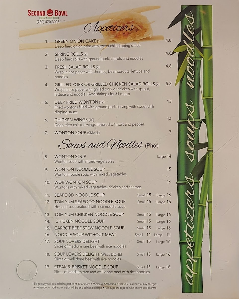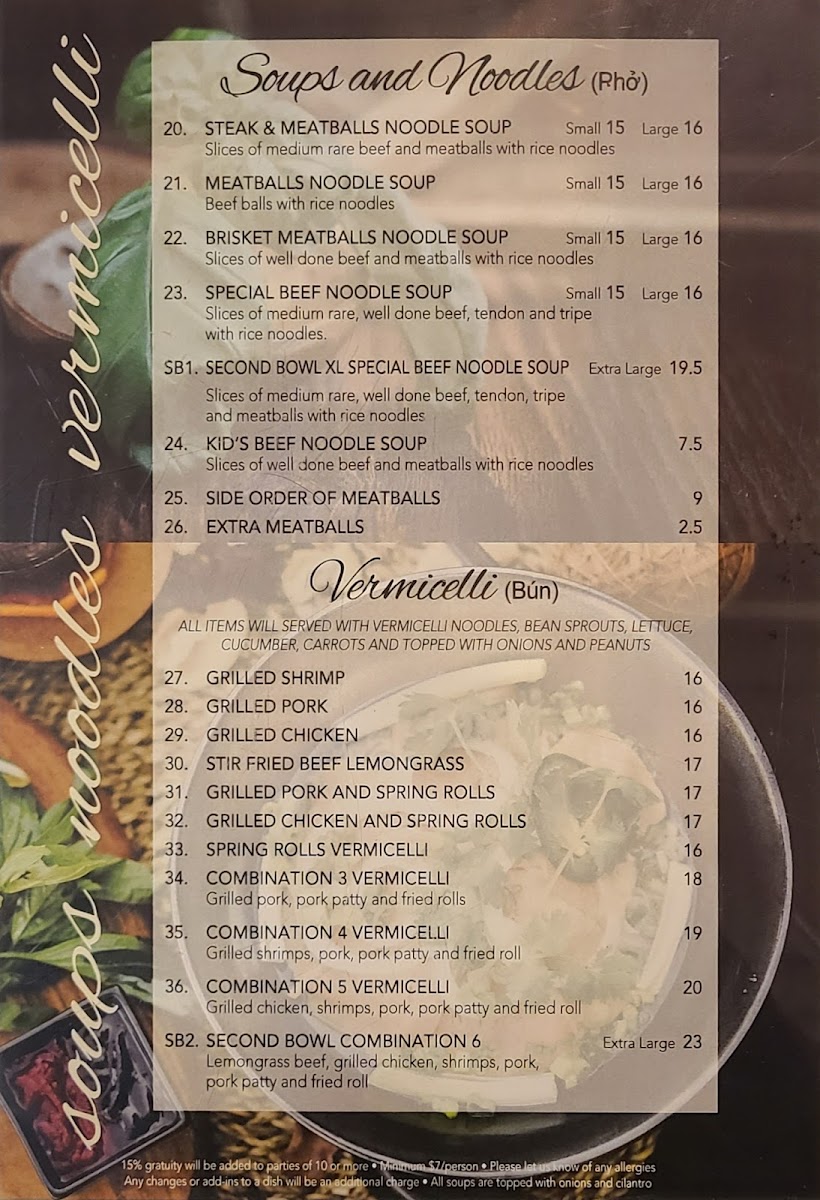 From a reviewer’s perspective, the menu at Second Bowl feels like a well-rounded showcase of comforting Asian and Vietnamese-inspired dishes, thoughtfully curated to satisfy both quick cravings and full meals. Starting with appetizers, classics such as Green Onion Cake, Spring Rolls, Fresh Salad Rolls, Grilled Pork or Grilled Chicken Salad Rolls, and Deep Fried Wonton set a familiar and inviting tone. The soups and noodles section stands out for its variety and depth, featuring warming options like Wonton Soup, Wonton Noodle Soup, Wor Wonton Soup, Seafood Noodle Soup, and the bolder Tom Yum Seafood Noodle Soup, all ideal for those seeking rich broths and hearty portions. Beverage choices, including Soft Drinks, Black Coffee, Ice Tea, Milk Coffee, and Lemon Soda, are simple yet sufficient, complementing the savory dishes without distraction. What truly defines the menu is the specialty soup selection, where Central Vietnamese Soups, Beef Satay Soup, Chicken Satay Soup, and Shrimps Satay Soup bring distinctive aromas and layered flavors that highlight regional influences. For rice lovers, satisfying plates such as Grilled Chicken on Rice, Grilled Chicken and Spring Rolls on Rice, Grilled Pork Chop on Rice, Grilled Pork Chop, Egg, and Spring Roll on Rice, and Grilled Shrimps and Beef Lemongrass on Rice deliver hearty, balanced meals. The vermicelli options-Grilled Shrimp, Grilled Pork, Grilled Chicken, Stir Fried Beef Lemongrass, and Grilled Pork and Spring Rolls-offer lighter yet flavorful alternatives. Finally, dishes like Seafood Chow Mein, Beef Chow Mein, Chicken Chow Mein, Deluxe Chow Mein, and Steak & Meatballs Noodle Soup round out the menu, reinforcing Second Bowl’s strength in variety and comfort. Overall, the menu feels cohesive and reliable, making Second Bowl a solid choice for diners seeking familiar flavors done with care.