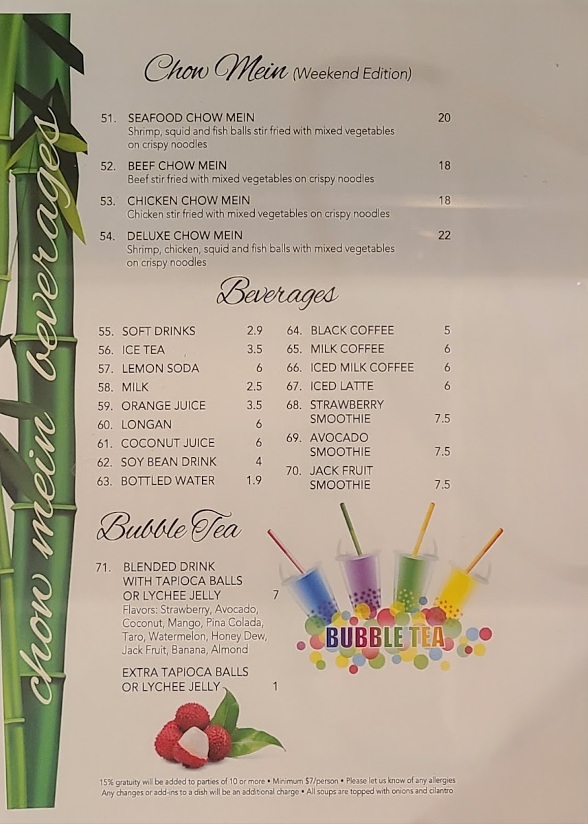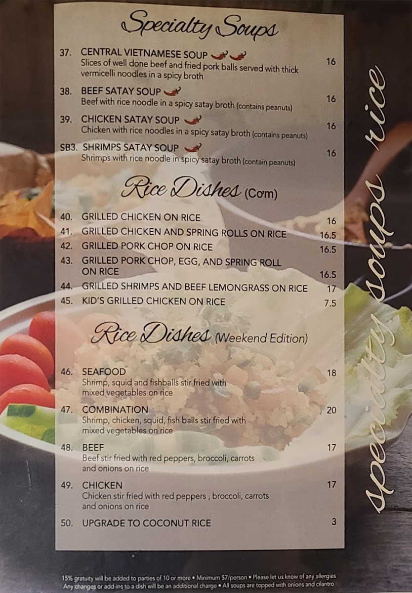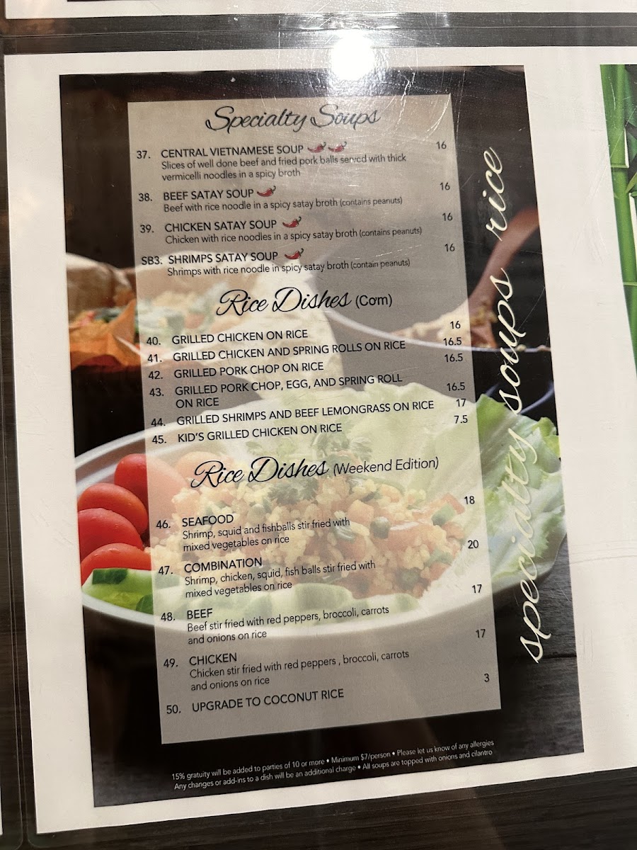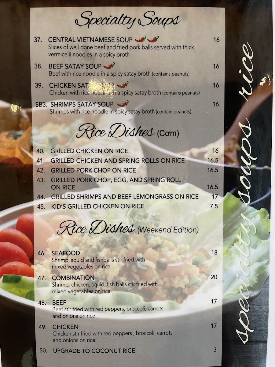 From a reviewer’s perspective, the menu at Second Bowl feels like a well-rounded showcase of comforting Asian and Vietnamese-inspired dishes, thoughtfully curated to satisfy both quick cravings and full meals. Starting with appetizers, classics such as Green Onion Cake, Spring Rolls, Fresh Salad Rolls, Grilled Pork or Grilled Chicken Salad Rolls, and Deep Fried Wonton set a familiar and inviting tone. The soups and noodles section stands out for its variety and depth, featuring warming options like Wonton Soup, Wonton Noodle Soup, Wor Wonton Soup, Seafood Noodle Soup, and the bolder Tom Yum Seafood Noodle Soup, all ideal for those seeking rich broths and hearty portions. Beverage choices, including Soft Drinks, Black Coffee, Ice Tea, Milk Coffee, and Lemon Soda, are simple yet sufficient, complementing the savory dishes without distraction. What truly defines the menu is the specialty soup selection, where Central Vietnamese Soups, Beef Satay Soup, Chicken Satay Soup, and Shrimps Satay Soup bring distinctive aromas and layered flavors that highlight regional influences. For rice lovers, satisfying plates such as Grilled Chicken on Rice, Grilled Chicken and Spring Rolls on Rice, Grilled Pork Chop on Rice, Grilled Pork Chop, Egg, and Spring Roll on Rice, and Grilled Shrimps and Beef Lemongrass on Rice deliver hearty, balanced meals. The vermicelli options-Grilled Shrimp, Grilled Pork, Grilled Chicken, Stir Fried Beef Lemongrass, and Grilled Pork and Spring Rolls-offer lighter yet flavorful alternatives. Finally, dishes like Seafood Chow Mein, Beef Chow Mein, Chicken Chow Mein, Deluxe Chow Mein, and Steak & Meatballs Noodle Soup round out the menu, reinforcing Second Bowl’s strength in variety and comfort. Overall, the menu feels cohesive and reliable, making Second Bowl a solid choice for diners seeking familiar flavors done with care.